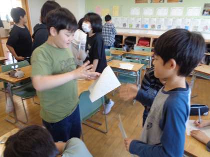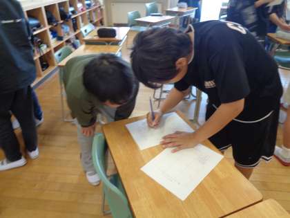 ふれあいタイムでは、友達ビンゴをしました。友達に「はい」「いいえ」で答えられる質問をして、「はい」だったらサインをもらう活動です。誰に行けばサインがもらえるかを考えながら声をかけていました。