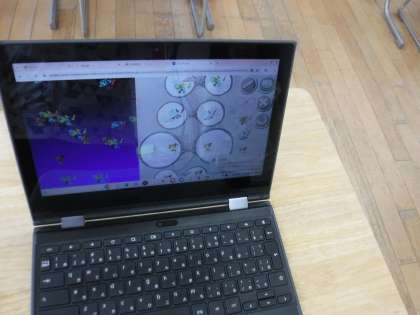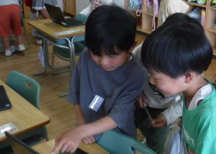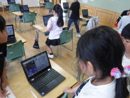 「ビスケット」というプログラミングソフトを使い、自分で描いた絵を動かす活動をしました。基本的なやり方が分かると、子供たちは思い思いの絵を描き、動きを考えて表現していました。最後には互いに作品を見合い、「おもしろいね」「すごいのができたね」など、感想を伝え合っていました。