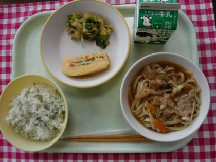 今日の給食の献立は、菜めし、牛乳、千種焼き、おひたし、かやくうどん でした。