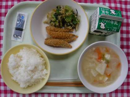 5月21日(火)今日の給食 公開日 2024/05/21 更新日 2024/05/21 本日の給食 今日の給食の献立は、ごはん、牛乳、きびなごのさくさく揚げ、ごまびたし、呉汁、のり佃煮 でした。 大豆を水に浸し、すりつぶしたものを「呉(ご)」と言い、その呉をみそ汁に入れたものを、「呉汁(ごじる)」と言うそうです。大豆の甘みが感じられ、とてもおいしかったです。