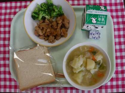 5月22日(水)今日の給食 公開日 2024/05/22 更新日 2024/05/22 本日の給食 今日の給食の献立は、食パン、牛乳、野菜のスープ煮、ゆでブロッコリー、鶏肉のレモン煮、ポケットチーズ でした。 野菜のスープ煮には、じゃがいも、キャベツ、人参、セロリ等、たっぷりの野菜が入っていました。肉団子も入っており、栄養満点のスープでした。