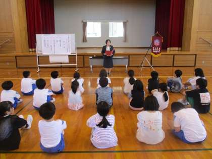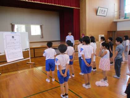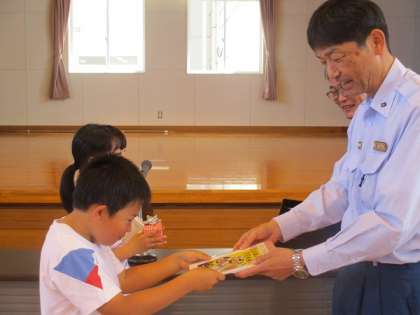 今日はBFCバッチ授与式がありました。校長先生や消防署の方の話を真剣に聞き、代表児童がBFCバッチと冊子を授与しました。