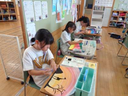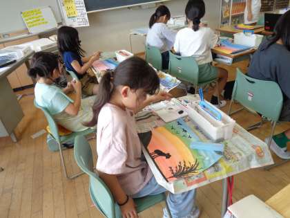 図画工作科では、水と絵の具のバランスを考えて、色を塗る学習をしています。