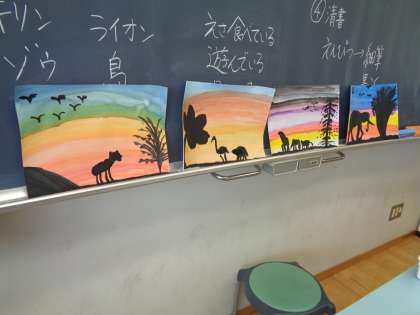 夕暮れ時のサバンナを想像して、思い思いの場面を描きました。