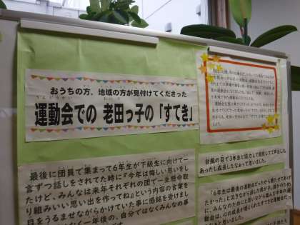 先日tetoruで配信した、「運動会での老田っ子の『すてき』募集」に、何人もの保護者の方々が応えてくださっています。温かいメッセージ、ありがとうございます。いただいた「すてき」は、児童玄関前に掲示しています。募集期間は、明日(5/25)までとしています。よろしくお願いいたします。