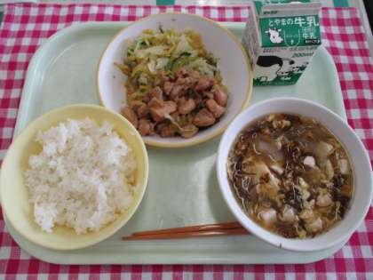 今日の給食の献立は、ごはん、卵ともずくのスープ、合わせあえ、あっさりチキン でした。ごはんが進むおかずがいっぱいで、おいしくいただきました。