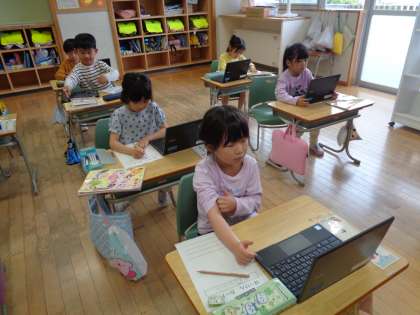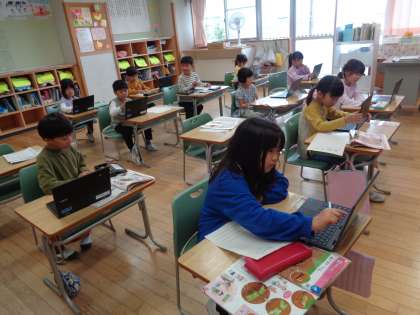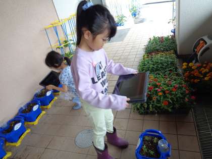 大切に蒔いたあさがおが芽を出し、とてもうれしそうな子供たち。よく見たり触ったりするだけでなく、クロムブックで記録写真を撮りながら、観察を進めています。教室に戻り、発見したことをカードに丁寧にまとめていました。
