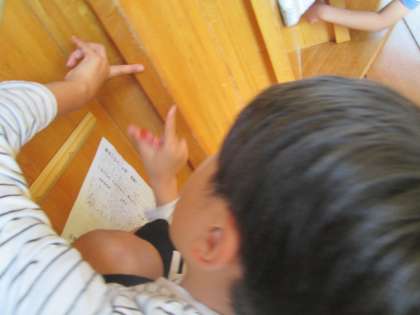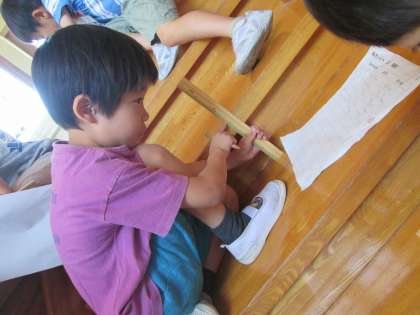 算数科では「長さはかりたい」として、身近なものの長さを予想し、実際にはかる活動をしています。竹ものさしや自分の親指と人差し指を広げた「あた」を基準にして予想していました。