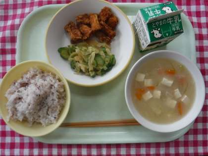 今日の給食の献立は、雑穀入りごはん、牛乳、いかのかりん揚げ、華風和え、すいとん でした。
