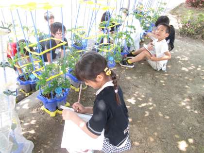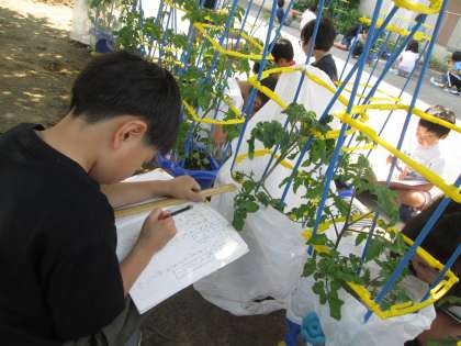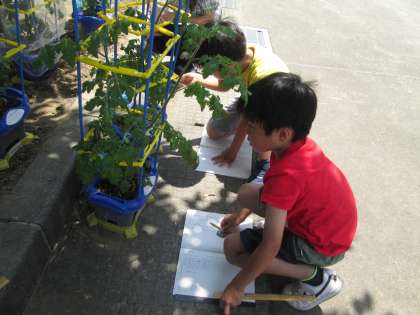 育てているミニトマトのことを読む人が分かる文章にしょうと丁寧に観察しています。