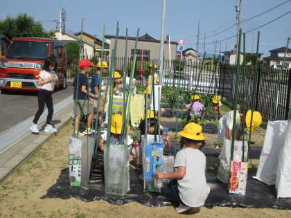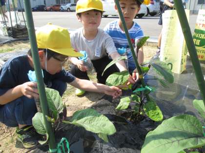 休み明けの畑の様子が気になり、朝の時間に水やりへ行きました。今週は暑くなるので、野菜にもたっぷり水をあげました。もうナスの実がなっていて、大喜びの子供たちです。