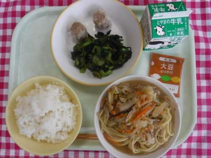今日の給食の献立は、ごはん、牛乳、肉シューマイ、しょうがひたし、とんこつラーメン、大豆ふりかけ でした。