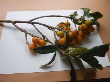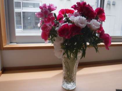 上の写真のピンクのお花は、「ゴデチア」という名前だそうです。たわわに実った枇杷(びわ)の枝もいただいたので、下の写真のように、お花と一緒に飾らせていただきました。ありがとうございました。