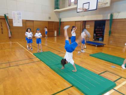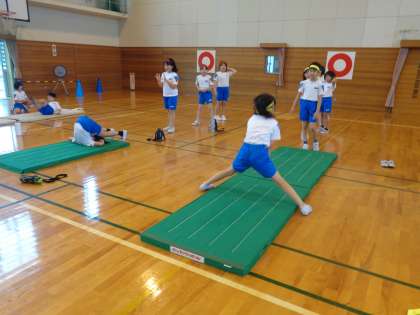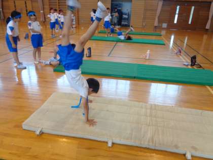 体育科ではマット運動を行っています。練習を重ねるうちに、できる技が増えています。次は連続技に挑戦します。