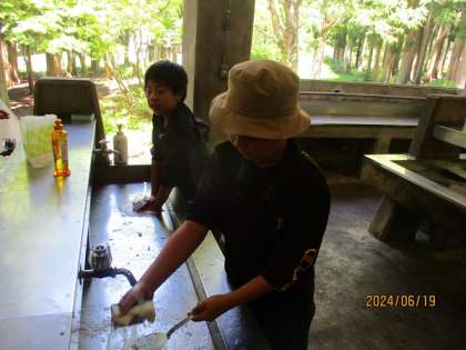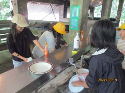 野外炊飯の片付け、大変だけどがんばりました。帰りはきれいな景色を見て所に帰りました。