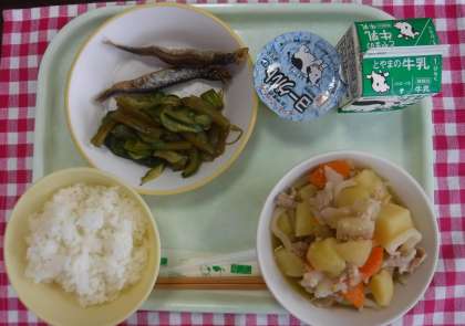 今日の給食の献立は、ごはん、牛乳、ししゃもの米粉揚げ、茎わかめの中華和え、塩肉じゃが、ヨーグルト でした。