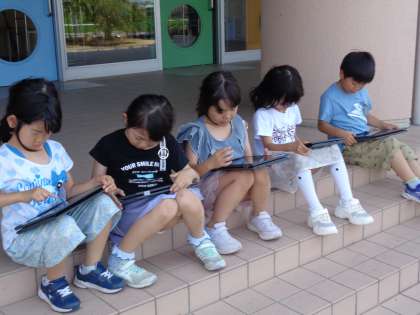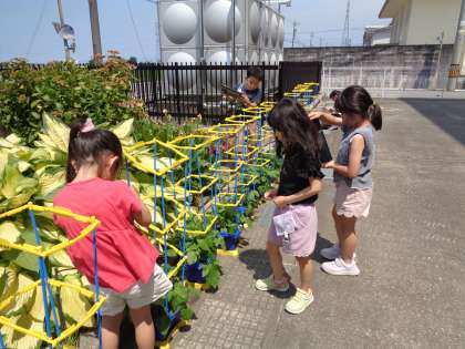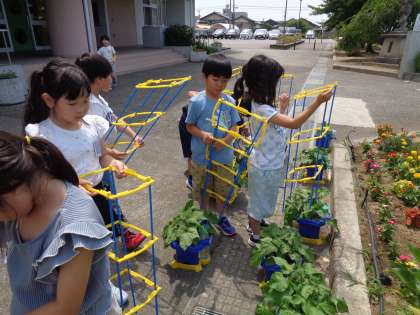 大切に育てているあさがおがぐんぐん成長しています。隣のあさがおと蔓が絡まないように、支柱を立てました。また、観察するあさがおが分かりやすいように、目印のラッピングタイを付けました。本葉の数に注目しながら観察を進めていきます。