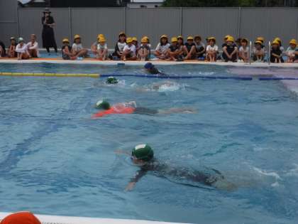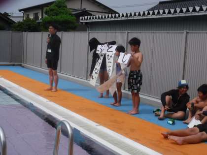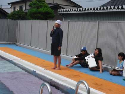 運動委員会の児童が会の運営を担当し、水泳学習を安全に行うための約束を確認しました。高学年代表児童の模範泳法の披露もありました。