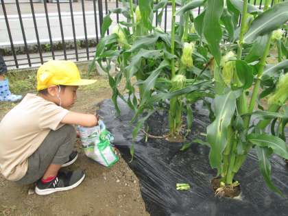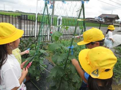 収穫をしたグループもあれば、実り始めた実を守ろうと工夫するグループもあります。それぞれが自分たちの野菜を大切に育てています。