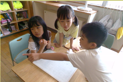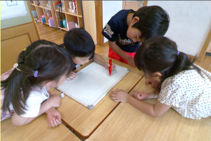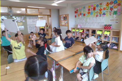 今日のふれあいタイムは、「◯◯と言えばゲーム」をしました。「夏と言えば」「楽器と言えば」など、出されたお題に合わせて、班で協力して答えを書きました。