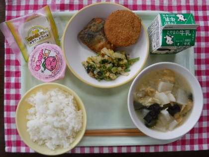 今日の給食の献立は、ごはん、牛乳、いり大豆和え、具だくさんみそ汁、魚のカレー揚げ または ハムチーズフライ、ももゼリー または レモンタルト でした。