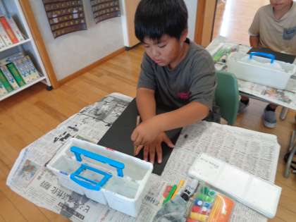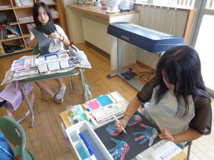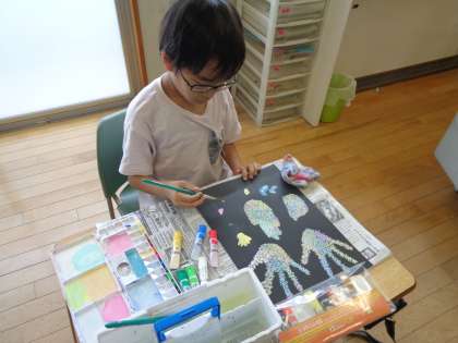 グー、パー、まっすぐなパーの形を丁寧になぞり、色をつけていきます。