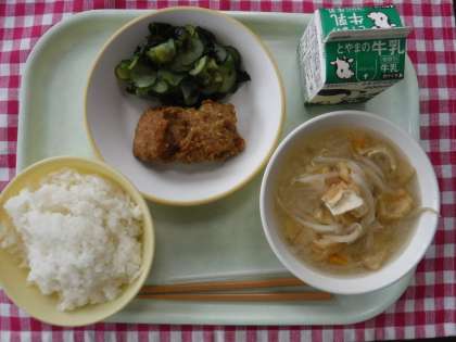 今日の給食の献立は、ごはん、牛乳、魚の利久揚げ、酢の物、みそ汁 でした。