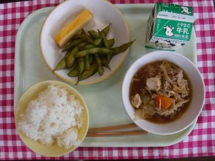 今日の給食の献立は、ごはん、牛乳、枝豆、厚焼き玉子、韓国風すき焼き でした。