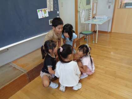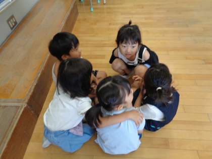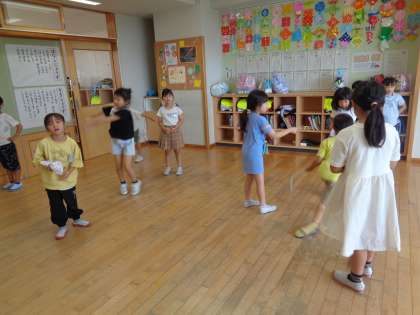 まずは、色鬼をしました。安全に留意し、歩いて行いました。鬼が相談して決めた色をすばやく色を見付けてタッチしていました。
