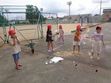 シャボン玉遊びでは、うちわやストローを使って、きれいなシャボン玉を飛ばしました。