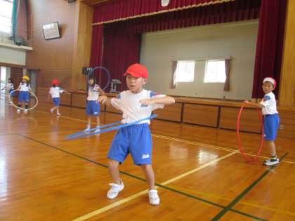 フラフープ遊びでは、いろいろな回し方を考えたり、長い間続けて回したりと、自分で決めて試しています。