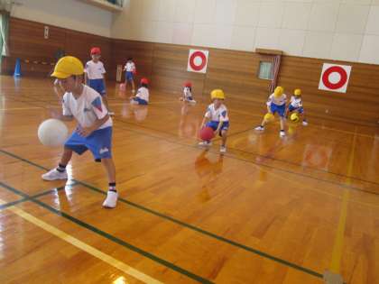 ボール遊びでは、上に投げたり、ドリブルしたりしています。