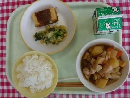 今日の給食の献立は、ごはん、牛乳、揚げ出し豆腐のごまだれかけ、コーン和え、大和煮 でした。