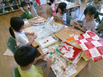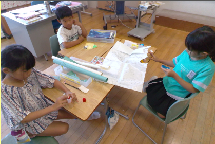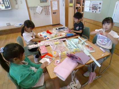 図画工作科の授業で、「やぶいた かたちから うまれたよ」の学習をしました。家から持ってきた包装紙を破き、できた形が何に見えるか考えました。「新幹線に見える!」「組み合わせたらきりんになった!」など、それぞれに見立てたものを画用紙に貼りました。