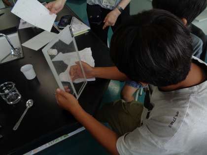 理科の学習で、地層のでき方について実験をしました。れき、砂、どろが層になっている様子がよく分かりました。