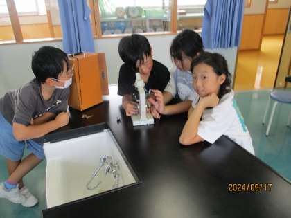 理科では、花粉を見るために顕微鏡を使用しました。花粉が見えると歓声があがっていました。