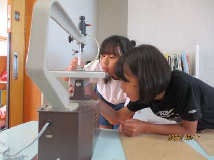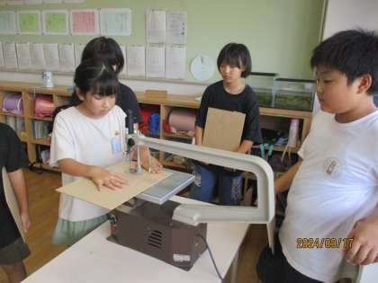 また、図工ではオリジナルボードを作るために電動糸のこぎりを使いました。付ける作業が難しかったようですが、切る作業はみんなとっても上手に行っていました。