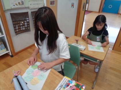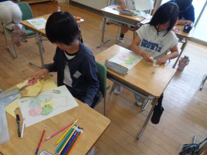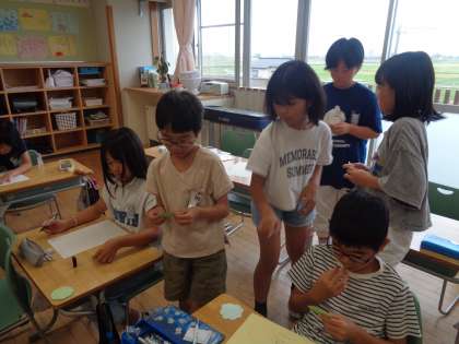 宿泊学習の振り返りをしています。「班長として毎回集合の声をかけてくれてありがとう」「舟作りのときに、ひもをしばるのが上手で助かったよ」「ザリガニがつれないときにアドバイスしてくれてうれしかったよ」等、同じ班の友達の素敵な姿を伝え合いました。