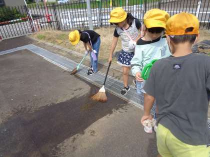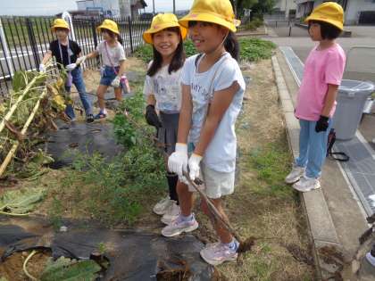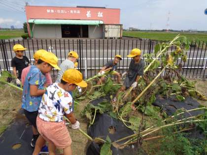 子供たちは、「ひまわりの根が強いな」「大きなかぶみたいだね」と言いながら、茎を抜き、種を採りました。