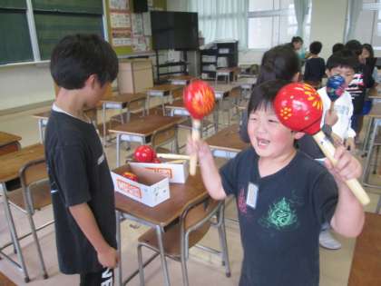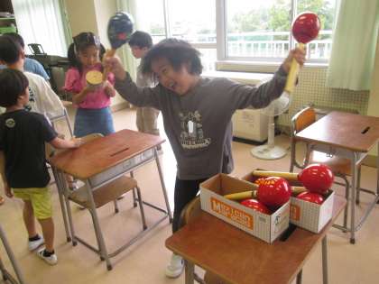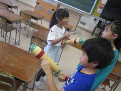 図画工作科「音づくりフレンズ」の学習の参考にしようと、音楽室で楽器を観察しました。