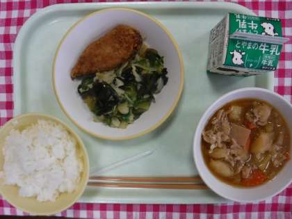 今日の給食の献立は、ごはん、牛乳、豚肉の炒め煮、サバの竜田揚げ、酢の物 でした。