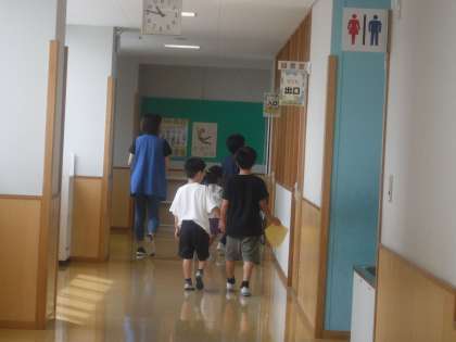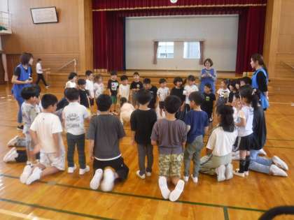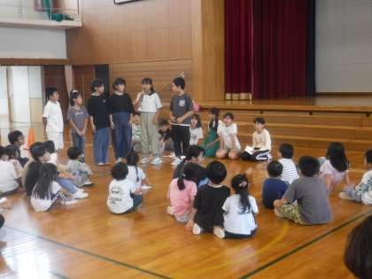 老田保育所の年長さんをお迎えし、2回目の保育所交流を行いました。今回の交流での活動は、校内スタンプラリーと体育館でのレクリエーションです。校内のいろいろな部屋を紹介しながら案内したり、優しくフォローしながら一緒にゲームを楽しんだりしました。
