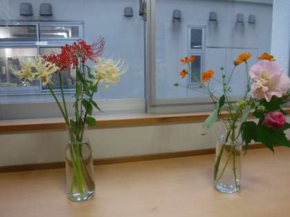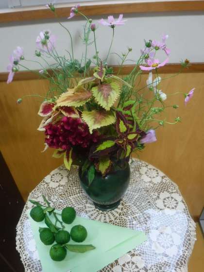地域の方がお花を届けてくださいました。ヒガンバナ、コスモス等、お花から秋の深まりを感じることができます。緑色の実は、柚です。大きさはピンポン球ほどです。まだ香りはしませんが、季節の移ろいを感じさせてくれます。