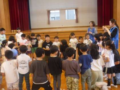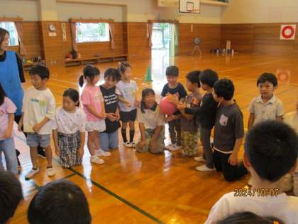 最後はレクリエーションで爆弾ゲームをしました。ボールを持っていた人が自己紹介をするルールで、保育所の子が困っていると、優しく声をかける5年生がたくさんいました。