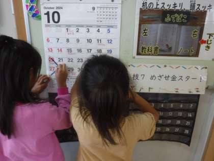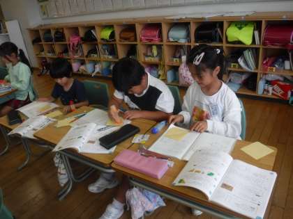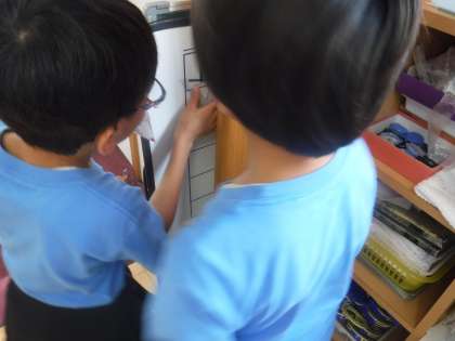 「正方形」について学んでいました。ノートにまとめた後は、教室やワークスペースにある正方形を探しました。正方形のきまりを思いだしながら見当をつけ、三角定規や竹ものさしで実際に測りながら確かめていました。