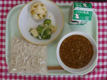今年度初のソフトめん、1年生にとっては初めての体験です。上手に少しずつ袋から出し、カレーソースにつけながら食べることはできたでしょうか。挽肉たっぷりのカレーソースは、キーマカレーのようでとてもおいしかったです。