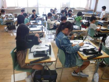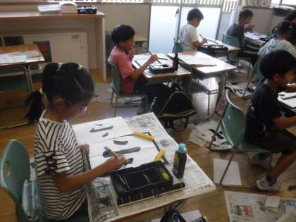 10月11日(金)3年生 書写 公開日 2024/10/11 更新日 2024/10/11 3年生 毛筆で「小」と書く練習をしていました。簡単な文字ですが、とめ、はね、はらい等、気を付けて書くポイントがたくさんあります。1画目は、「トン・スー・トン」と唱えながら、始筆や筆の運び方に気を付けて書きました。