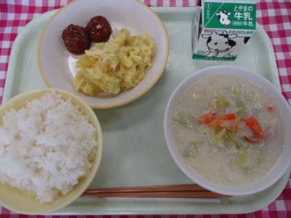 10月16日(水)今日の給食 公開日 2024/10/16 更新日 2024/10/16 メール用カテゴリ 今日の給食の献立は、ごはん、豆乳野菜スープ、チーズおさつ、ミートボールでした。 さつまいもがおいしい季節になりましたね。さつまいもの甘みとチーズのまろやかさが合わさり、おいしくいただきました。