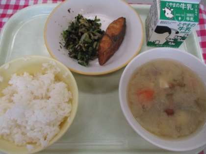 10月17日(木)今日の給食 公開日 2024/10/17 更新日 2024/10/17 メール用カテゴリ 今日の給食は、ごはん、牛乳、あげざかなのレモン味、いそあえ、なめこ汁でした。 なめこ汁には、なめこ以外にも大根、にんじん、ねぎ、豆腐等、たくさんの具材が入っており、栄養満点でした。