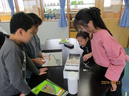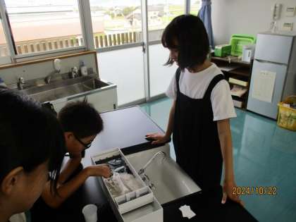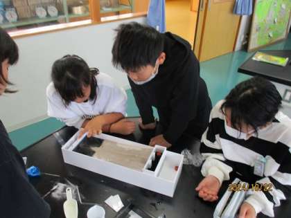今日は流れる水のはたらきを調べるために、実験セットを使って実験しました。流れる水には浸食、運搬、堆積のはたらきがあることを学びました。